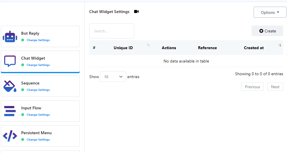 - Within the Telegram Bot Manager, select the `Chat Widget` section and click on the `Create` button.